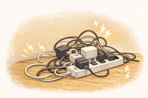 たとえば、「充電したらコードを戻す」「使わないときは電源オフにする」など、ゆるめのルールを紙に書いて貼っておくだけでも効果あり。